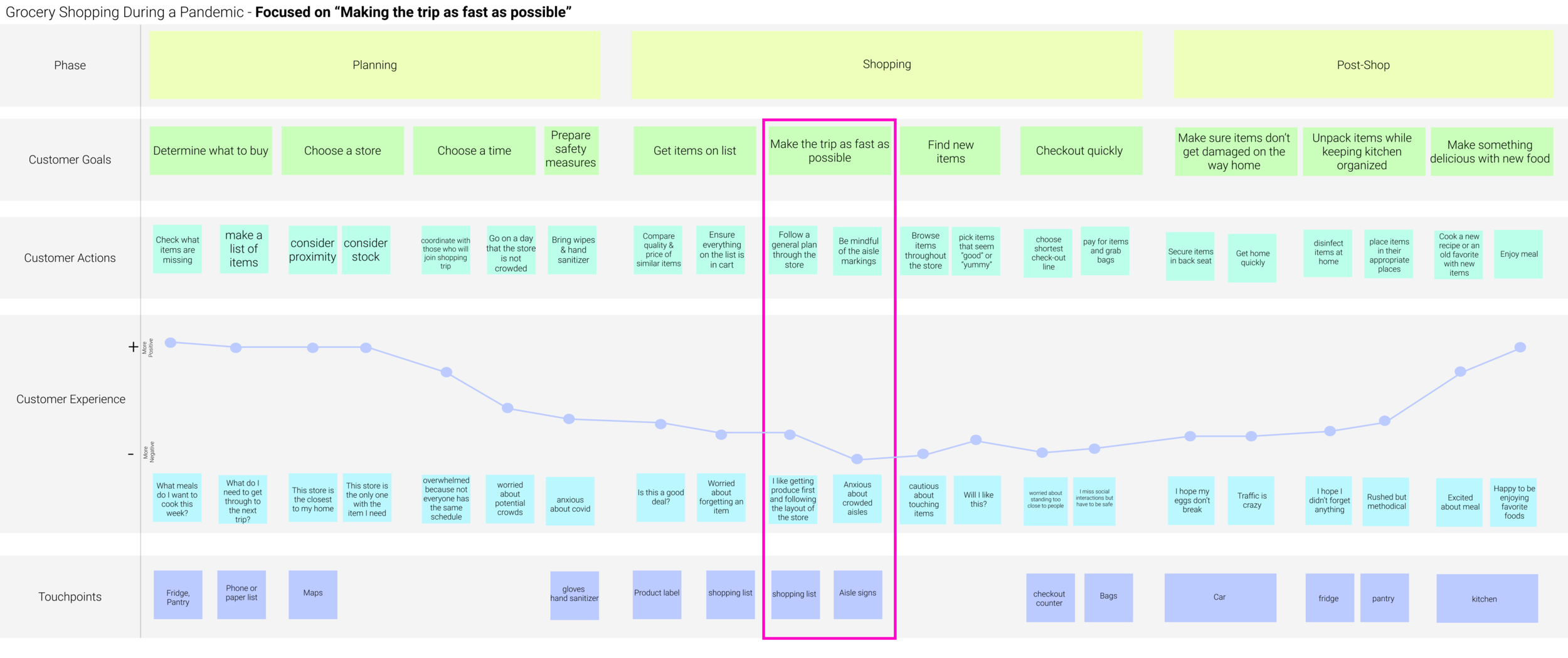 After completing our individual interviews, the team gathered to present and synthesize our collective findings. In order to do this, we scattered each point from all twelve of our individual customer journey maps in order to begin affinity diagramming and synthesize our interviews. Due to the large number of data, we created separate affinity diagrams for the planning, shopping, and post-shop phases found in out customer journey maps. We looked at each of our formed clusters to find a pattern and create a consolidated customer journey map. The team discussed as a group to determine what specific “slice” of the customer journey map would benefit most from a design solution and bring value to its users. We determined that, while shoppers have specific pain points across the board, the inclusion of a design solution in the actual “shopping” phase would provide the greatest value to users.